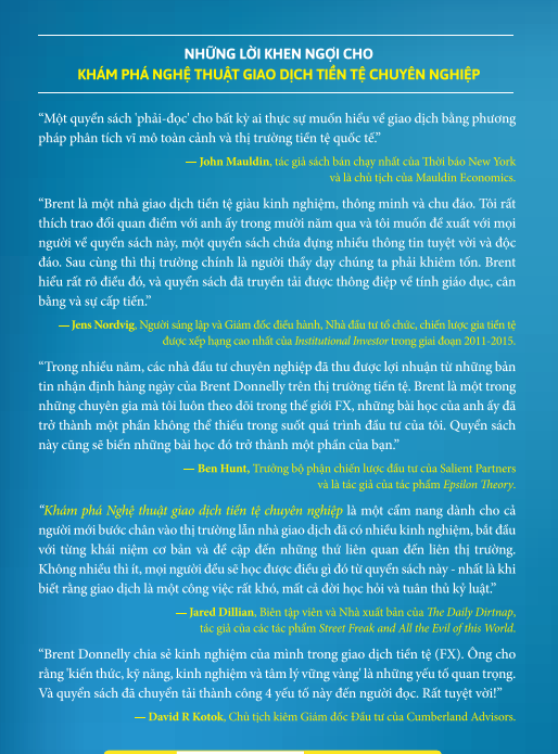 “Khám phá Nghệ thuật Giao dịch Tiền tệ Chuyên nghiệp” là cuốn sách giáo khoa FX không thể thiếu. Brent Donnelly — một trader giàu kinh nghiệm với gần 30 năm trong ngành, từng đảm nhận vị trí cao cấp tại các ngân hàng lớn như Citi, Nomura, và HSBC New York — chia sẻ hành trình nghề nghiệp của mình một cách chân thực và bài bản